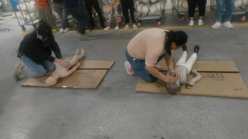隨后,公司組織員工進(jìn)行了休克、昏迷緊急救護(hù)演練,呼吸心跳驟停緊急救護(hù)演練,所有員工參加了心肺復(fù)蘇操作訓(xùn)練。