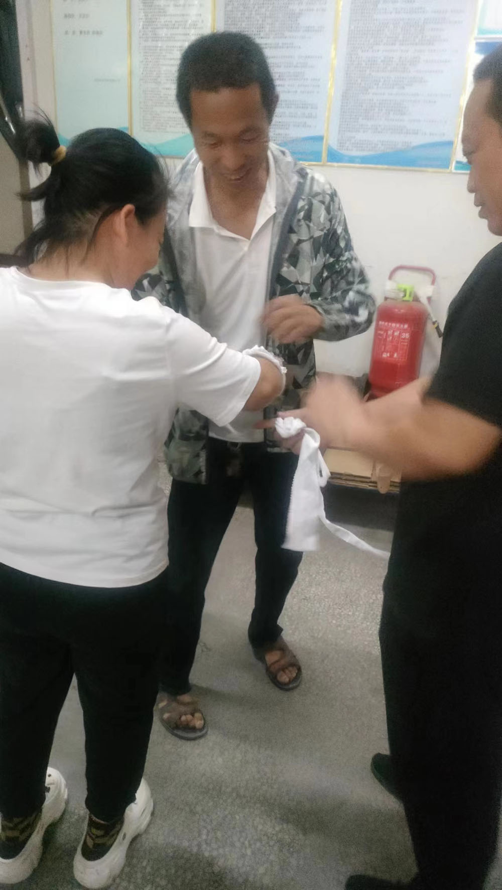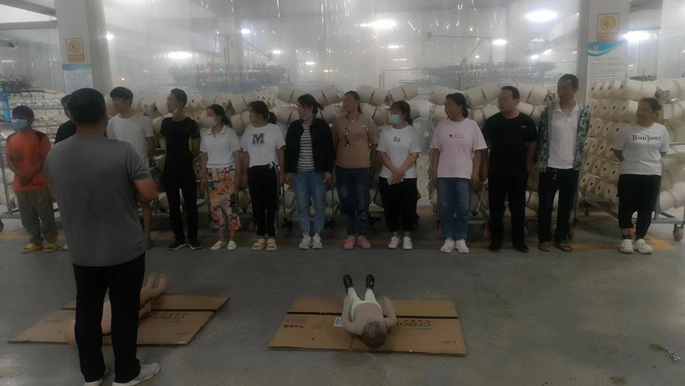 首先,模擬車間生產(chǎn)現(xiàn)場(chǎng)出現(xiàn)機(jī)械傷害事故,有員工被卷入大圓機(jī)中受傷,馬上啟動(dòng)應(yīng)急預(yù)案。各應(yīng)急小組緊張地投入到應(yīng)急救援工作之中,搶救傷員、救護(hù)包扎、緊急聯(lián)絡(luò),各項(xiàng)工作有序展開(kāi)。救援小組立即關(guān)停機(jī)器,將受傷員工從機(jī)器中搶救出來(lái)。救護(hù)小組給傷員檢查傷情,包扎止血。聯(lián)絡(luò)小組打120請(qǐng)求派救護(hù)車緊急救護(hù),受傷員工得到了及時(shí)救治。